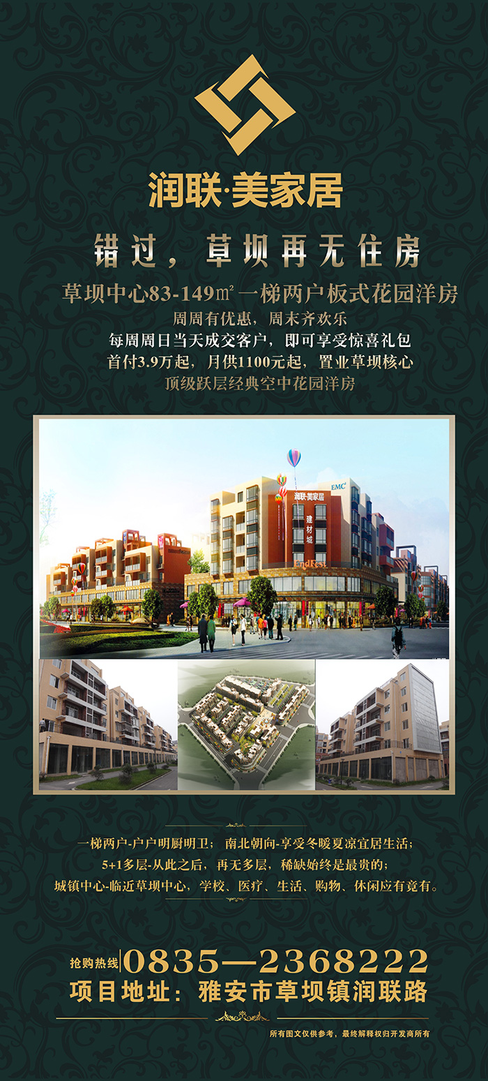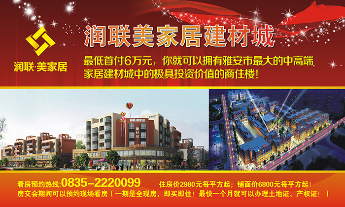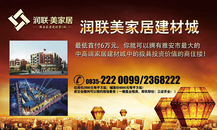 潤(rùn)聯(lián)美家居建材城,位于四川雅安市,由香港潤(rùn)聯(lián)國(guó)際投資有限公司投資,雅安市潤(rùn)聯(lián)投資置業(yè)有限公司開(kāi)發(fā)并傾力打造的雅安市中高端家具建材飾品以及家裝一體化的大型生態(tài)型家居購(gòu)物MALL。